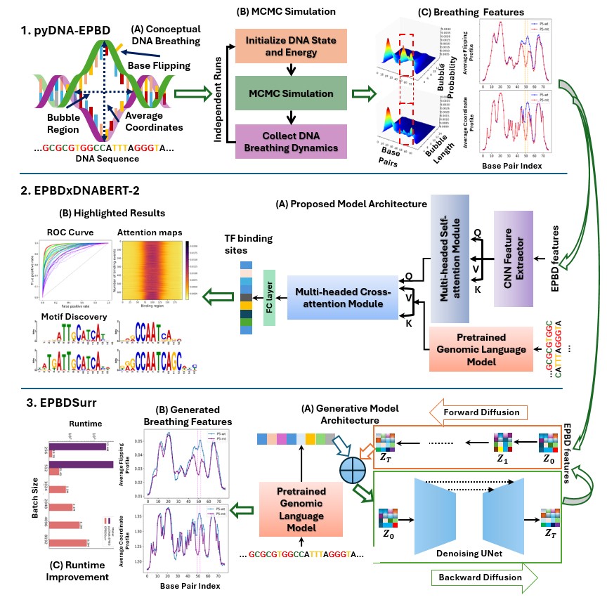 - Kabir, A., Bhattarai, M., Peterson, S., Najman-Licht, Y., Rasmussen, K. Ø., Shehu, A., … Usheva, A. (2024). DNA breathing integration with deep learning foundational model advances genome-wide binding prediction of human transcription factors. Nucleic Acids Research, 52(19), e91. doi:10.1093/nar/gkae783